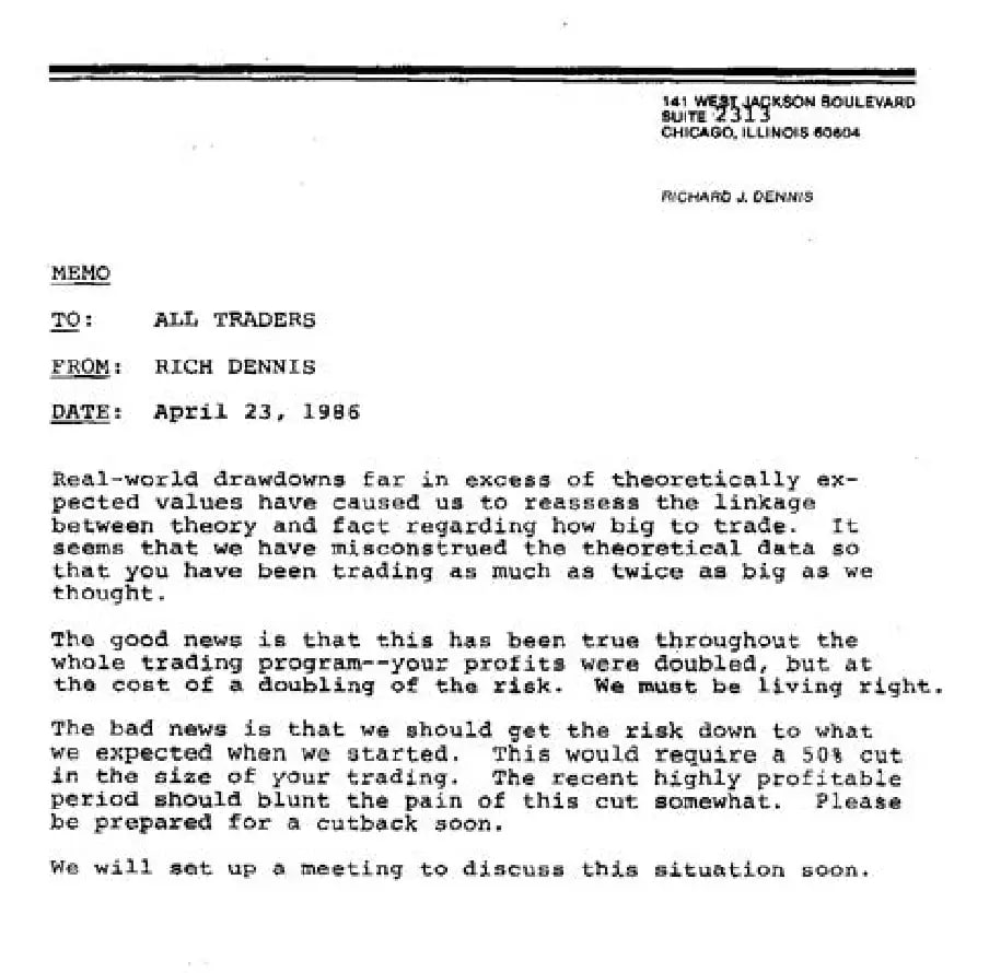 데니스 리치는 이 소식을 접한 후, 뒤늦게나마 자신의 실수를 인정하고, 1회 매매 손실 한도를 절반인 1%로 바꾼다는 내용을 수강생들에게 알립니다.