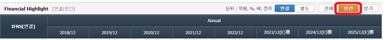 재무 정보는 기본값으로 전체, 즉, 연간 정보와 분기 정보를 적절히 혼합해서 보여주는 데,