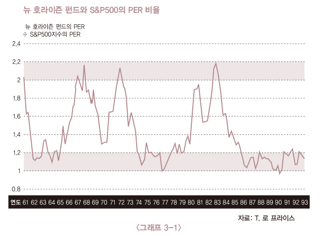 대형주로 이루어진 S&P500 지수 포함 종목과 소형주로 이루어진 뉴 호라이즌 펀드 종목의 평균 PER를 보면, 소형주와 대형주는 주기적으로 강세 시기가 바뀐다.